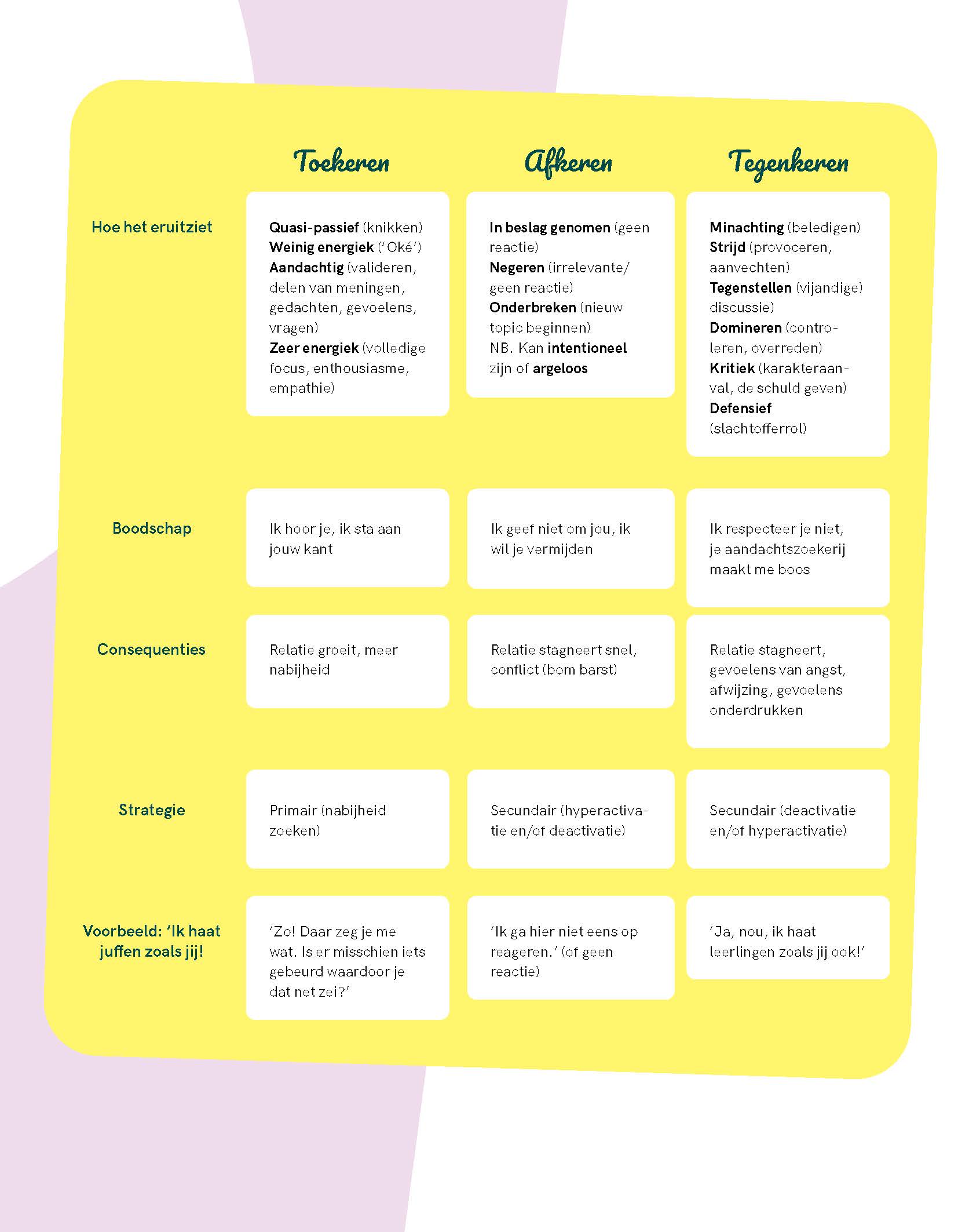 Figuur 1 – Drie manieren van reageren op relatiebouwstenen. Noot. Dit figuur is gebaseerd op het werk van het Gottman Institute (2000; 2011)