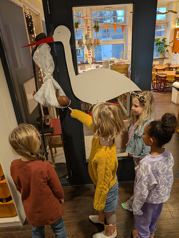 Het is maandagochtend en de kinderen van groep 3 druppelen binnen. Bij het raam van de huishoek staat een ooievaar met een doek in de bek. Uit het doek steken een hoofd en tien kleine teentjes. ‘Kijk, een baby!’ roepen de kinderen. Allerlei vragen komen naar boven. ‘Waarom draagt de ooievaar een baby? Wat betekent dit voor ons? En, waar komen baby’s eigenlijk echt vandaan?’