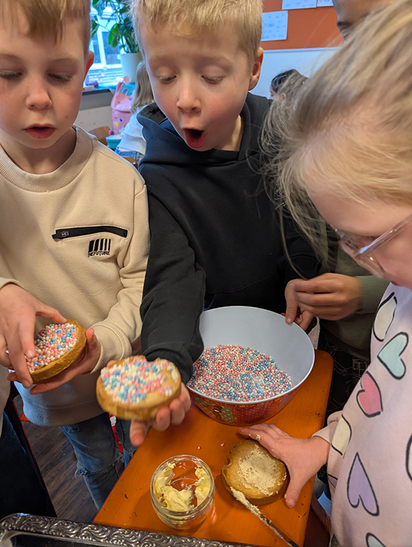 We besluiten in de klas goed voor de baby te zorgen en onderzoeken hoe we dat het beste kunnen doen. We boren ervaringen van de kinderen aan (betekenisgeving), nodigen experts uit in de groep en duiken de boeken in. Daarin lezen we onder andere over kraamvisite en beschuit met muisjes. Dat willen we zelf ook wel even proeven! De volgende dag staan er twee rollen beschuit, twee pakjes muisjes en een kuipje boter klaar. De kinderen experimenteren met de muisjes en ervaren dat ze zonder boter allemaal van de beschuit af rollen (verkennen en experimenteren). Muisjes op een beschuit schudden is ook best een klus, maar een beschuit met boter in de muisjes dippen blijkt een groot succes!