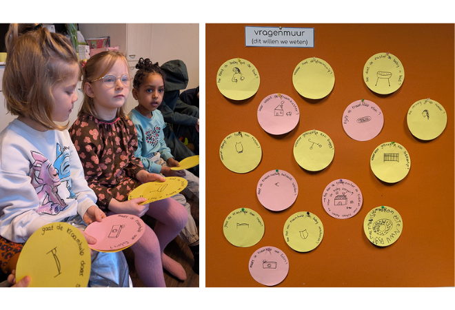 Om de onderwerpen, interesses en kwesties die de kinderen bezighouden te ‘vangen’ in vragen is een vragenmuur of vragenwand een goede optie. Zo krijgen de vragen van de kinderen een duidelijke plek in het geheel en is het mogelijk om inhoudelijk verder in te gaan op onderwerpen waarover de kinderen zich verwonderen (betekenisgeving). Wardekker (2021) zegt hierover: ‘Verwonderen is het begin en verbeelden is de motor.’ Professionals kunnen helpen om de stap naar verbeelding te maken (de verbeelding stimuleren).