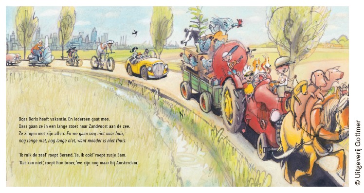 In Boer Boris gaat naar zee van Ted van Lieshout & Philip Hopman wordt dit principe duidelijk. Halverwege schrijft Van Lieshout: “Daar gaan ze in een lange stoet naar Zandvoort aan de zee.” Hopman tekent hierbij een optocht van vervoersmiddelen die achter elkaar aan rijden. Als je tijdens het voorlezen tegelijkertijd de plaat toont én de stoet op de plaat aanwijst, is de kans groot dat jouw leerlingen begrijpen wat een stoet is. Het woord ‘stoet’ wordt zo eerst toegevoegd aan de passieve woordenschat van de leerlingen. Na herhaald voorlezen en actief gebruik van het woord door jou als leerkracht in andere situaties, zullen veel leerlingen dit woord ook aan hun actieve woordenschat toevoegen.