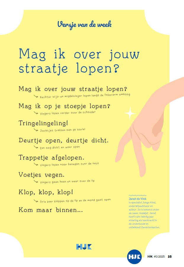 Door dit versje dagelijks in te zetten als taalroutine, bied je structuur en versterk je de woordenschat en het taalgevoel van de kinderen op een speelse manier.